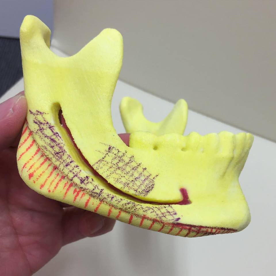 3D骨格模型にデザインを書き込むことで、術前の打ち合わせ時に、お客様と執刀医が骨切りデザインを共有できます。